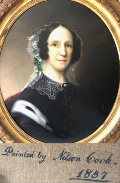 In July 2021 the portrait to the right was being auctioned by Coyle’s in Medway, MA. This was a case where Cook did not identify the sitter as part of his inscription, only that he painted it in 1857. As such, Coyle’s auction catalogue simply described the painting as “Oval portrait signed by Nelson Cook 1857.” The caretakers of this site first became aware of this painting a few days before the auction date. The portrait was a classic Cook – red chair, intricate lace detail, realistic facial features, and an inscription on the back in Cook’s distinctive hand. But who was the unknown woman in the painting? Were there any clues to her identity?