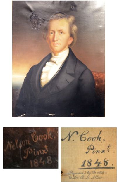 b. 14 Jan 1808 at Greenfield (Saratoga County), NY - d. 15 May 1873 in Saratoga Springs, NY; buried in Greenridge Cemetery, Saratoga Springs; son of a Quaker sea captain from New Bedford, MA; in 1836 married Aurelia Ann Putnam (1813-1894), granddaughter of Gideon Putnam, revered founder of Saratoga Springs and niece of Nancy Putnam; studied medicine in Finger Lakes town of Skaneateles, NY and then graduated from Fairfield Medical College in Fairfield, NY; taught for a time, then went to Saratoga Springs in 1832 and for the next six years practiced medicine with Dr. John H. Steel; continued in the pursuit of medicine while also serving as Postmaster of Saratoga County during President Martin Van Buren's administration; also wrote several books about the therapeutic value and curative powers of Saratoga Springs' water and produced a guide book for tourists to his fair city; very active in the National Medical Association of the United States and the NY State Medical Society, both of which he served as President for the Saratoga County chapters; in 1852 partnered with Dr. Myron N. Babcock as Allen and Babcock, which became a very large and successful practice; well known and respected in Saratoga Springs for his kindness and philanthropy. Although the portrait is in need of major restoration, this is a wonderful example of Cook's mid-career artistry, including his "patented" red chair. This is believed to be the only portrait Cook is known to have signed and dated on both the front and back, and in each case used the word "Pinxt," Latin for "painted it." The painting is 32" X 26".