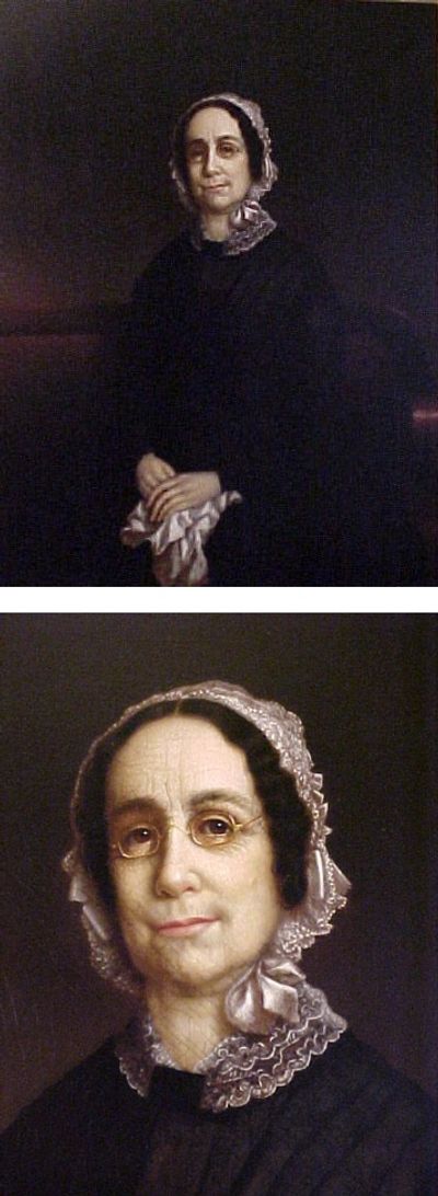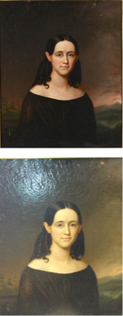 b. 4 Apr 1830, Saratoga Springs, NY - d. 13 Nov 1852, Saratoga Springs, NY; buried Greenridge Cemetery, Saratoga Springs; only child of Judge John Willard and Elizabeth Willard and wife of Henry Fowler (1824-1872), Presbyterian minister from Auburn, N Y. Sylvester's 1878 History of Saratoga County, New York described Sarah as "a young lady of rare beauty and culture"; signed by the artist on reverse, "Painted by Nelson Cook, Saratoga Springs, 1845"; a hand-written note on the painting's back also reads, "Susan Willard Fowler, daughter of Judge John Willard of Saratoga". Although Cook has not placed his young sitter in one of his patented red seats, the twin mountain peaks beyond her left shoulder appear in at least two other Cook portraits (see Unidentified Woman in Blue Gown and Portrait of a Girl. The 30" X 24" portrait was sold at auction by Millea Bros of Boonton, NJ for $527 (including a 24% buyer's premium) on May 23, 2014. The condition report stated the painting was "fair/poor, craquelure, scattered paint loss and flaking, especially to upper right." Soon after this sale the framed portrait was sold again by Scott Antique Market in Atlanta for $400. The new owner had both the painting and frame professionally restored and the portrait now proudly hangs in his Atlanta home. To the right is the painting before and after the restoration.