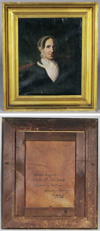 b. 11 Nov 1789 at Saratoga County, NY (?) - d. 7 Apr 1851 at Schuylerville, NY (Saratoga County); buried in Prospect Hill Cemetery, Schuylerville, NY; Signed verso "Susan English, born 11th Nov 1789, Painted by Nelson Cook, Saratoga Springs, 1845"; husband was David (1772-1853) and they had at least two sons, Richard English and Calvin D. English, who Cook painted in 1874. Susan’s portrait sold at auction via a floor sale on 3/9/08 in Fairfield, CT for $600 + a 20% buyer's commission. The auction house's pre-sale condition report said the following: "dirty, loose on stretcher, 3 holes, crazing, paint loss, wrinkles, but no earlier restoration."