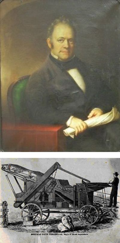 b. 2 June 1799, Clinton, ME - d. 1 July 1859, Buffalo, b. Mt. Hope Cemetery, Rochester; son of Abial and Abiah [Wade] Pitts; with his identical twin brother Hiram Abial Pitts (d. 10 Sep 1860, Chicago) this Maine native obtained a number of farm equipment patents, including one in 1830 for a portable, horse-powered treadmill, another in 1834 for the "Pitts Endless Chain Rotary Pump" signed by President Andrew Jackson, and probably their most lucrative patent in 1837 for the first threshing and separating machine, which was belt-driven and powered by horse or water wheel and called the "Pitts' Patent Separator". The two brothers developed separate manufacturing facilities, with John's factories moving over the years from Albany to Rochester to Springfield, OH and ultimately to Buffalo; John's threshers were known as "Dayton-Pitts" during his Ohio years, and eventually became known as "Buffalo-Pitts Threshers" (see below) following his death; John also received a gold medal at the 1855 Paris Exposition for a thresher attachment which measured and registered the number of bushels bagged. As evidenced by his more costly three-quarter length pose with exposed hands, John Avery Pitts was a man of means, which speaks to his great success as an inventor and the 50-year agricultural standard that was to be set by the Buffalo-Pitts Thresher. Mr. Pitts is shown proudly holding the plans for his thresher, and the words "Pitts' Patent Separator" are legible on the documents. Interestingly, Cook has seated Mr. Pitts in a green chair, a departure from the artist's characteristic preference for red, which may indicate a further customization of the portrait's composition to include furniture actually present in the Pitts's home. Only Mr. Pitts's portrait is signed by the artist, "Painted by N. Cook 1853", on the front at lower left. Both this painting and that of Mrs. Pitts below have undergone considerable restoration, including a great deal of overpainting and canvas repairs. Despite both portraits having significant amounts of new canvas added to the rear sections, small holes and tears still appear in each painting. The portraits in non-period frames were sold as a pair by Skinner, Inc. of Boston in December 2007 for $940.