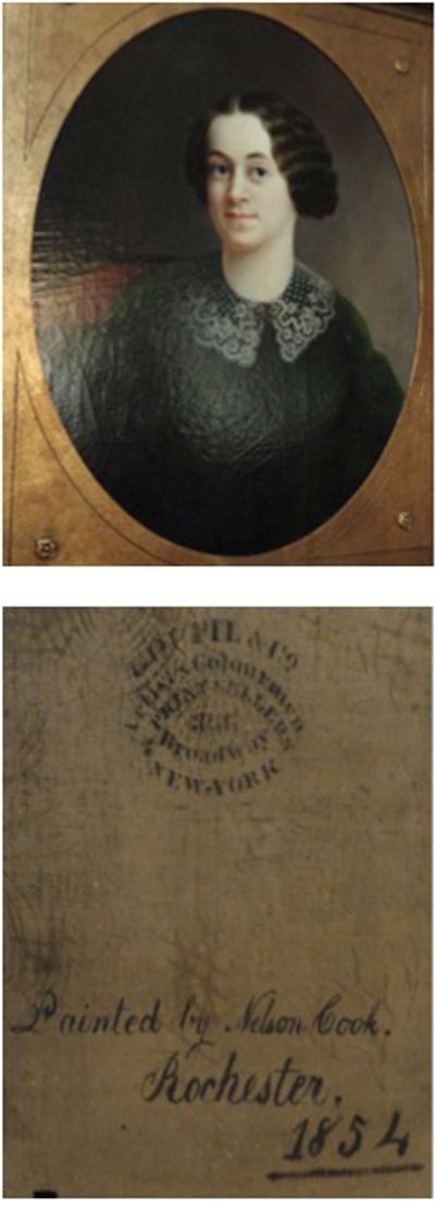 This portrait is a classic Cook work, including the artist's hallmark red seat and his finely crafted lace rendering. Although the woman in this painting is unknown, could she be Alice Chester, who is noted below? We may never know for sure, but the date and location are consistent with Cook's long-ago written reference to her. Along with the artist's signature, the portrait's reverse also carries the following stenciling, which has never been seen on another Cook painting: GOUPIL & CO / Artist's Colourmen & Print Sellers / 366 Broadway / NEW YORK. Goupil & Co. was a leading French art dealer and art materials supplier with offices throughout the world, including New York City. With Goupil's offices moving to 366 Broadway in 1854, it would appear Cook purchased the canvas for this portrait from the firm's trade catalog soon after their relocation.