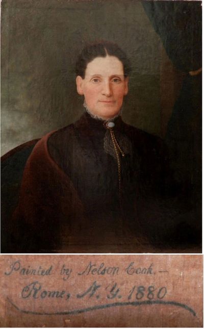 b. 13 Jun 1837 in Utica, NY - d. 15 Jun 1919 in Rome, NY; buried in Rome Cemetery; daughter of Rev. Henry Vogell, Baptist pastor at various times in Utica and Rome, NY; on 4 December 1860 married Dr. Willey J.P. Kingsley with whom she had three sons, the eldest died in infancy and the other two followed in their father's medical doctor footsteps; involved with many charitable causes in the Rome, NY area, including aid to needy children, and in 1961 a descendent continued the Kingsley legacy by willing $1 billion to the city of Rome, money, which even today continues to support many community organizations. In the latter part of 1879, Cook mentioned in several letters that his portrait of Dr. Kingsley had been delayed and that he would be painting Dr. Kingsley’s wife in several weeks’ time. As noted by Cook’s inscription on the back of this portrait, the rendering of this particular sitter was done in 1880. While a bit speculative, Cook’s portrait of Mrs. Kingsley may very well have been delayed until 1880 and she may have resurfaced in a most unlikely location far from her original, long-ago sitting in front of Cook’s easel. In December 2018 the Aragón Subastas de Arte auction house in Zaragoza, Spain sold a painting for $342 US of an unidentified young woman entitled "Retrato de Dama" ("Portrait of a Lady"). On the back was written "Painted by Nelson Cook, Rome, NY, 1880" and the woman pictured looks to be about Mrs. Kingsley's early 40s age. Although it's quite possible Cook painted other women in Rome, NY during 1880, in the absence of any other known portraits that meet these criteria, for the time being the caretakers of this site are comfortable assigning Mrs. Kingsley's identity to the Spain portrait.